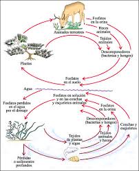 Los seres vivos toman el fósforo, en forma de fosfatos a partir de las rocas fosfatadas, que se descomponen y liberan los fosfatos.Una parte de estos fosfatos son arrastrados por las aguas del mar, en el cual lo toman las algas, peces y aves marinas, las cuales producen guano, el cual se usa como abono en la agricultura ya que libera grandes cantidades de fosfatos.